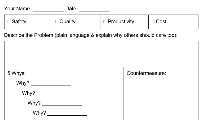 ![]() Suggestion Form A simple example form for your employee suggestion program, with a section for 5 Why’s. Download DOC file or learn more | Lean A3 Form Example An actual A3 from Pete’s time at Toyota. Download PDF file or learn more |