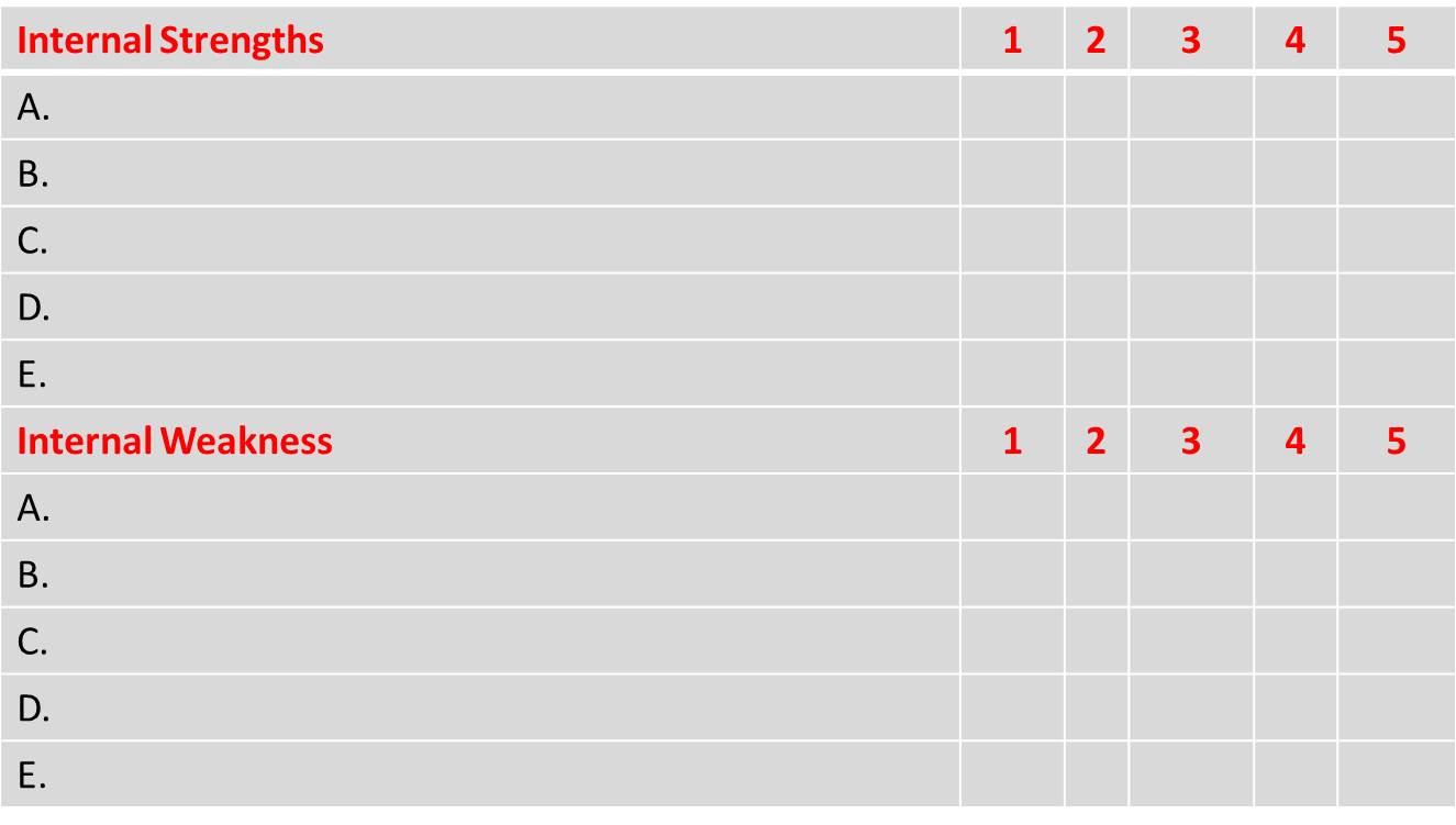 | External | Opportunities | Strategies that match internal strengths with external opportunities. | Strategies that match external opportunities with to minimize internal weakness. |